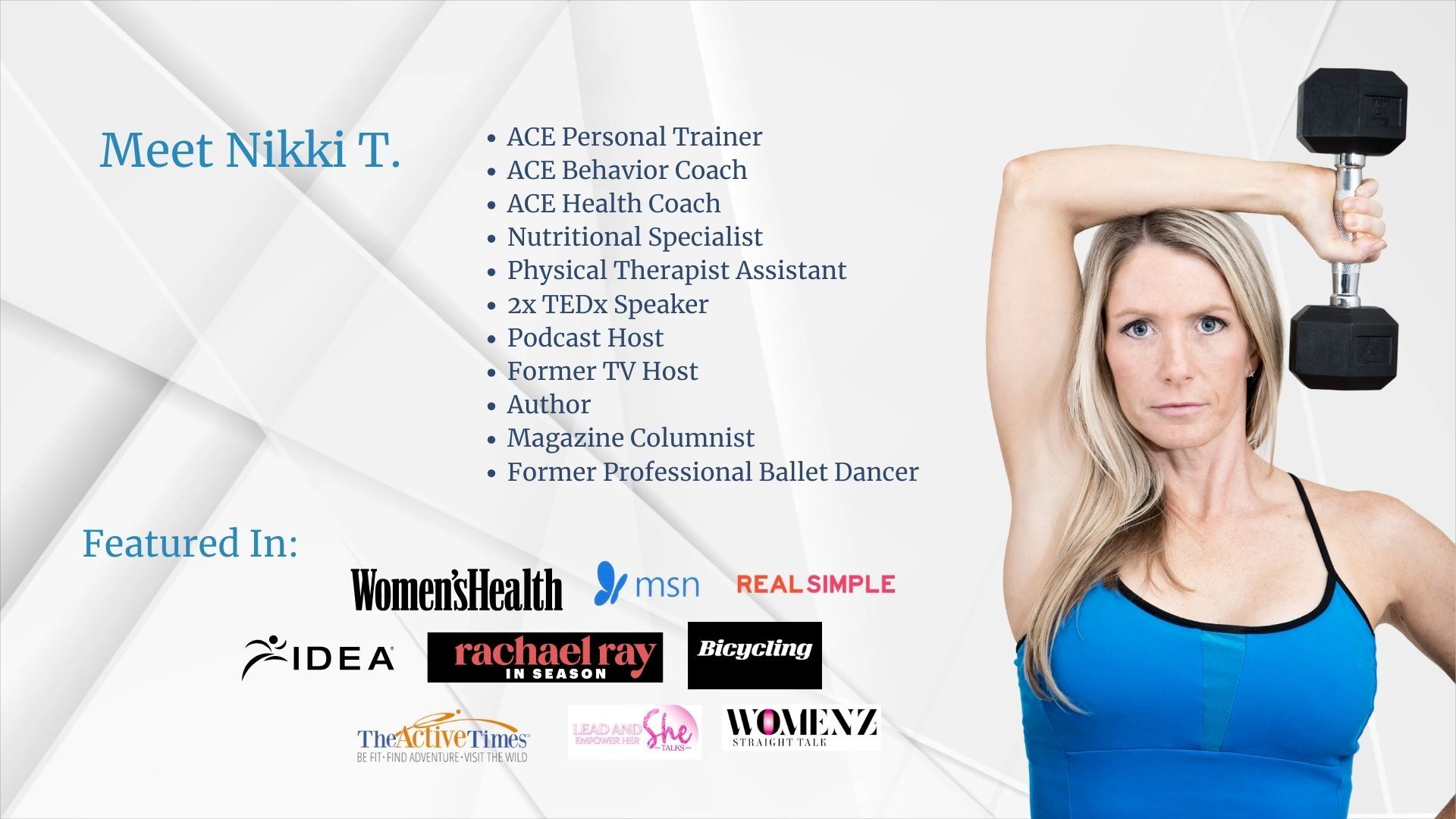 After my professional dancing career, I focused on obtaining certifications in Fitness, Nutrition, and Behavioral Change to compliment my mindset education and medical degree...
