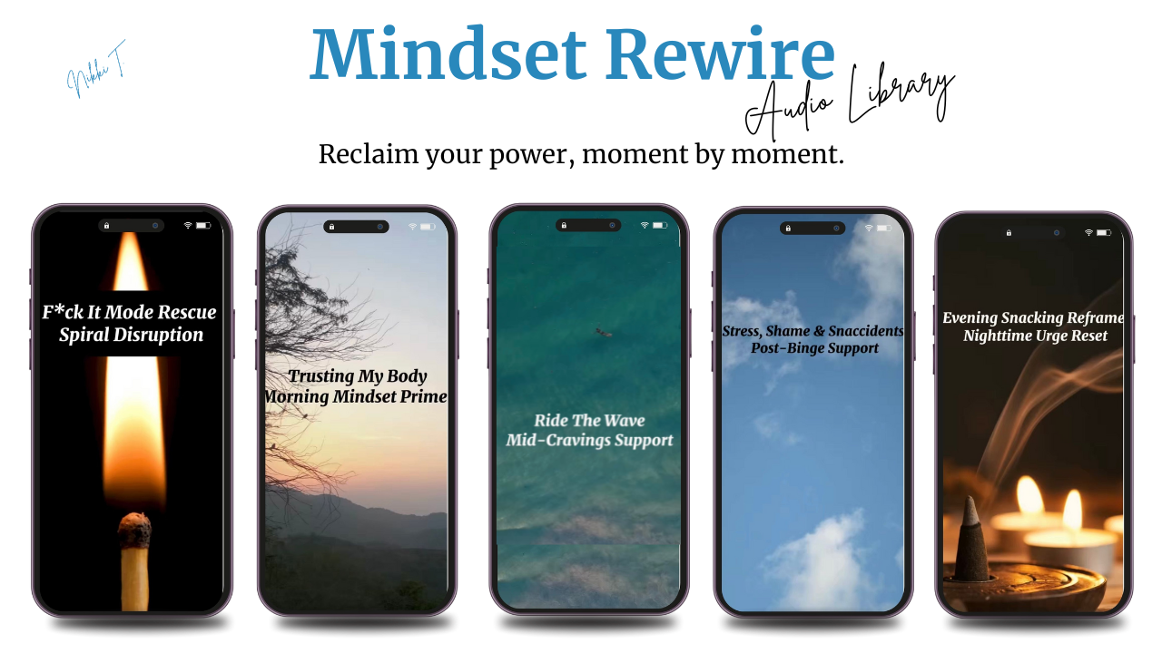 Guided audios that gently retrain your brain to ride the wave, interrupt sabotage, and build a peaceful, powerful new food narrative…without dieting or rules.